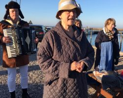 Vinterbadesæsonen fra trapperne i havnen er slut for denne gang. Som formand for vinter/morgenbaderne holdt Kirsten en lille tale. Knud spillede og sang “Nudistpolka” af Evert Taube og Birgitte havde pyntet op med sommerhatte. Efterfølgende var der hjemmebagt brød mm i Sejlklubbens Klubhus og Kurt blev kåret til Årets Havmand = endnu en skøn og frisk morgen. Foto Jette Elverdam