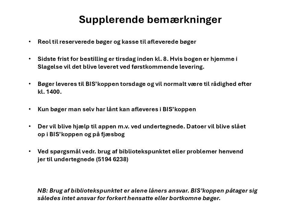 ved førstkommende levering. Bøger leveres til BIS’koppen torsdage og vil normalt være til