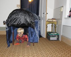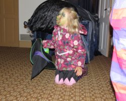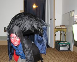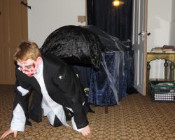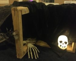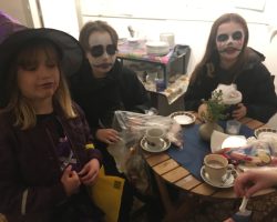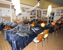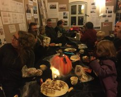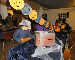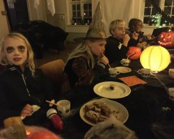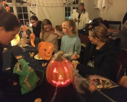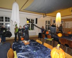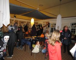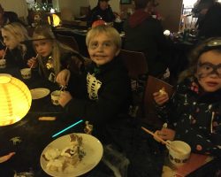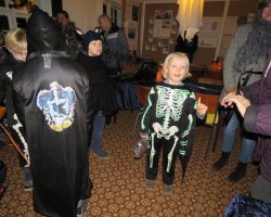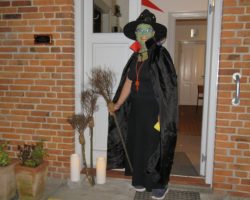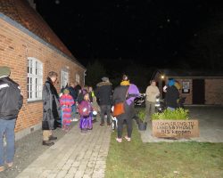 Omkring 40 uhyggeligt udklædte børn mødtes i aftes i Bis’koppen. Det store rum var fantastisk udsmykket med alskens uhygge. Der blev uddelt ruter og børn og voksne gjorde deeres bedste til at sprede uhygge hvor de kom frem. Der var dækket op med kakao og kager da elle kom tilbage, så det endte alligevel hyggeligt.